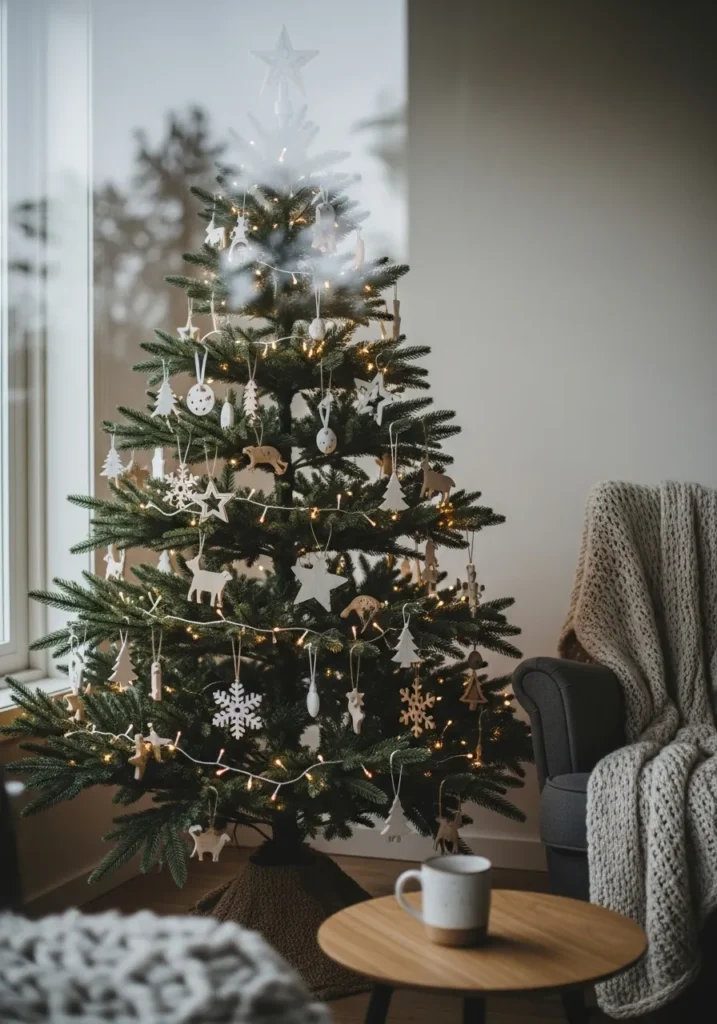 This tree’s design is understated yet beautiful, featuring natural wooden ornaments, white stars, and minimal lights. The overall feel is calm, clean, and effortlessly Nordic, with cozy knitted throws and neutral tones framing the space.