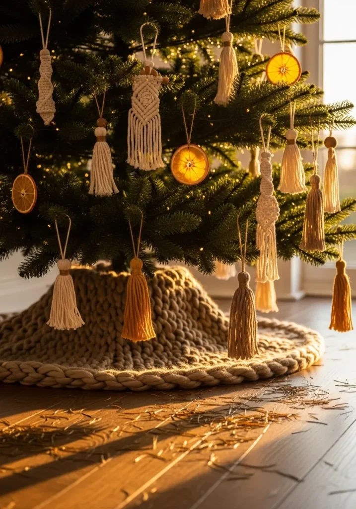 This Christmas tree feels effortlessly cozy with its mix of handcrafted macramé tassels and dried orange slice ornaments. The warm glow of golden hour light filters through the window, making each texture pop against the lush green branches. A chunky knit tree skirt adds an extra touch of softness, grounding the look with natural warmth.