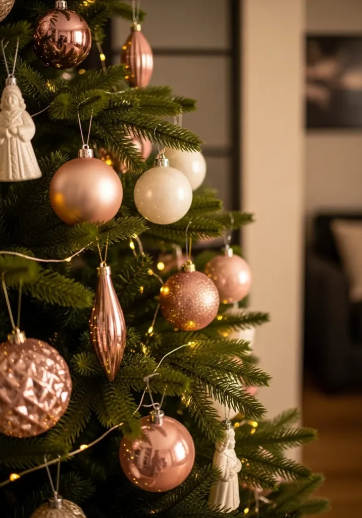 Soft pink and creamy white ornaments hang delicately on this tree, giving it a romantic and sophisticated touch. A mix of glossy and matte finishes adds texture, while warm fairy lights make everything glow gently.