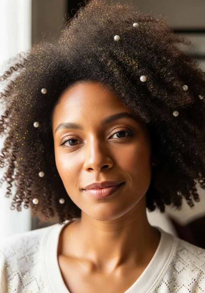 I absolutely love how this look feels like a celebration all on its own. The combination of glitter and pearls gives it such a festive personality, and it’s such a fun way to let natural curls shine front and center.