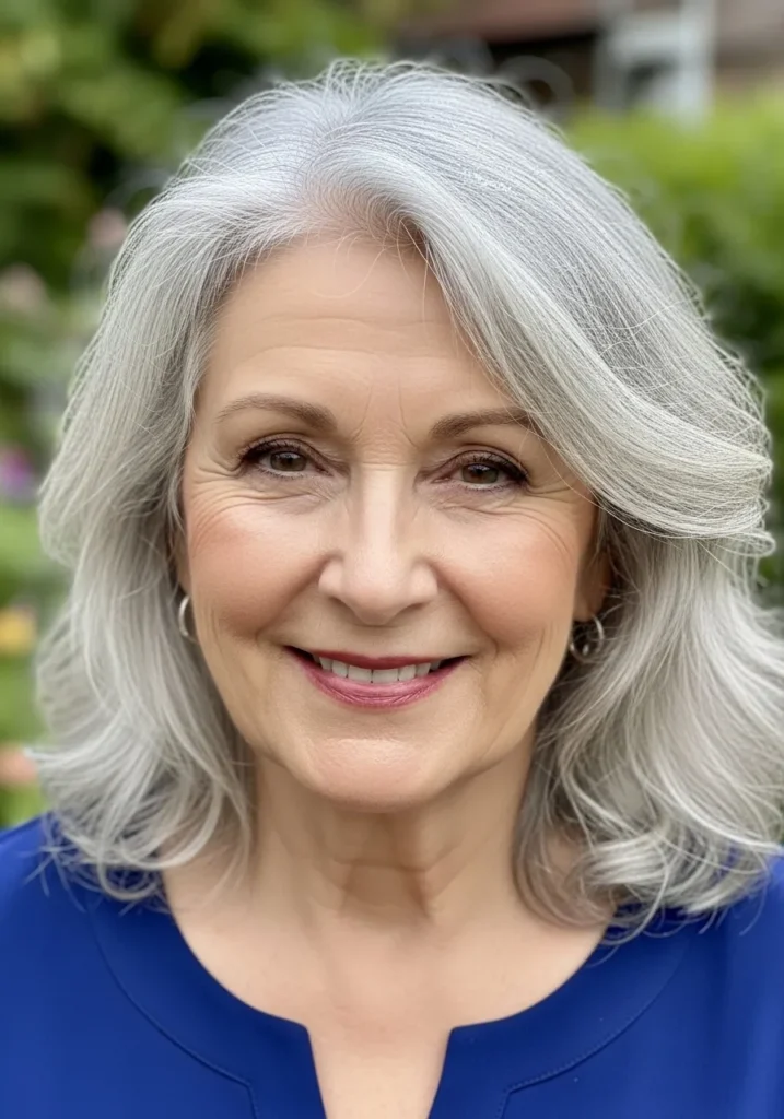 This shoulder-length silver hairstyle feels light, airy, and effortlessly elegant. The soft layers frame the face beautifully, and a subtle shimmer along the roots gives it a delicate, frosted glow.