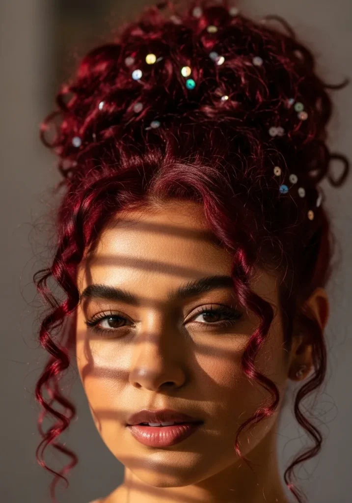 This rich burgundy updo is packed with personality. The curls are styled high into a voluminous bun, sprinkled with shimmering sequins that sparkle under any light. A few loose tendrils fall softly around the face, adding a flirty touch.