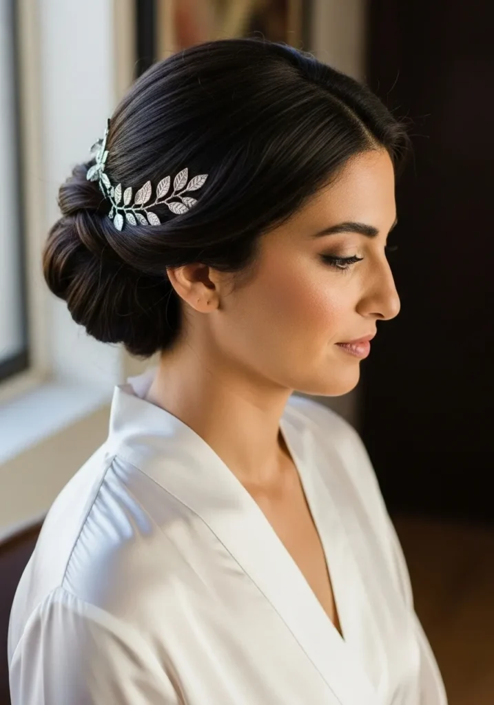 Elegant Low Bun with Leaf Hairpiece