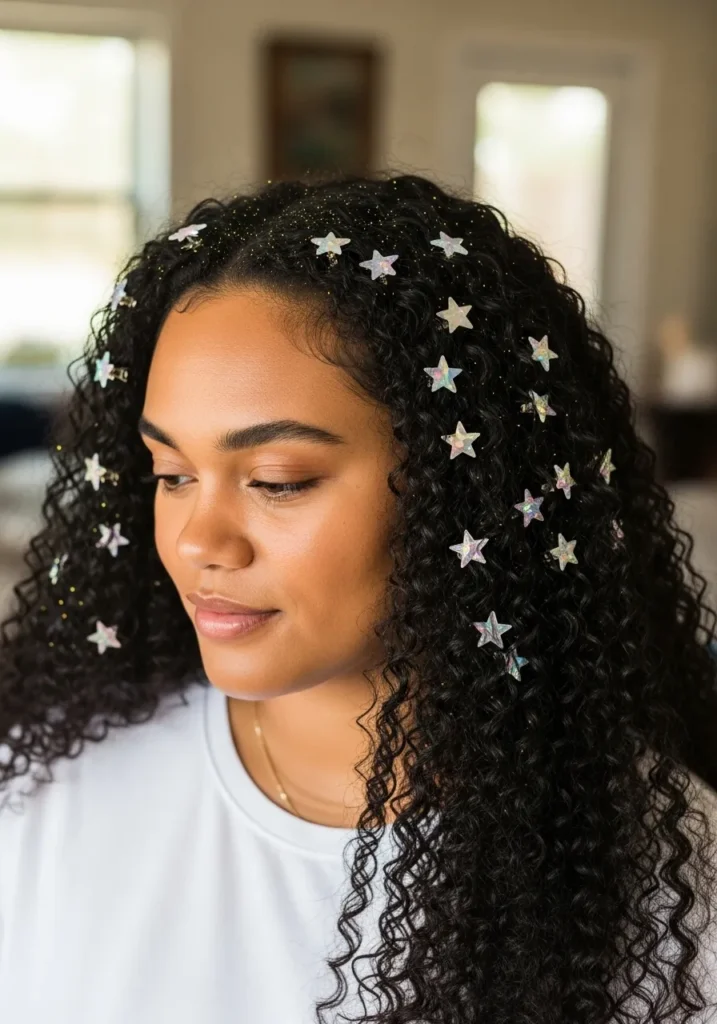 This long, curly hairstyle is full of volume and sparkle. The glossy black curls are scattered with shiny star-shaped clips and a dusting of fine glitter that twinkles as you move. It’s playful, festive, and full of personality.