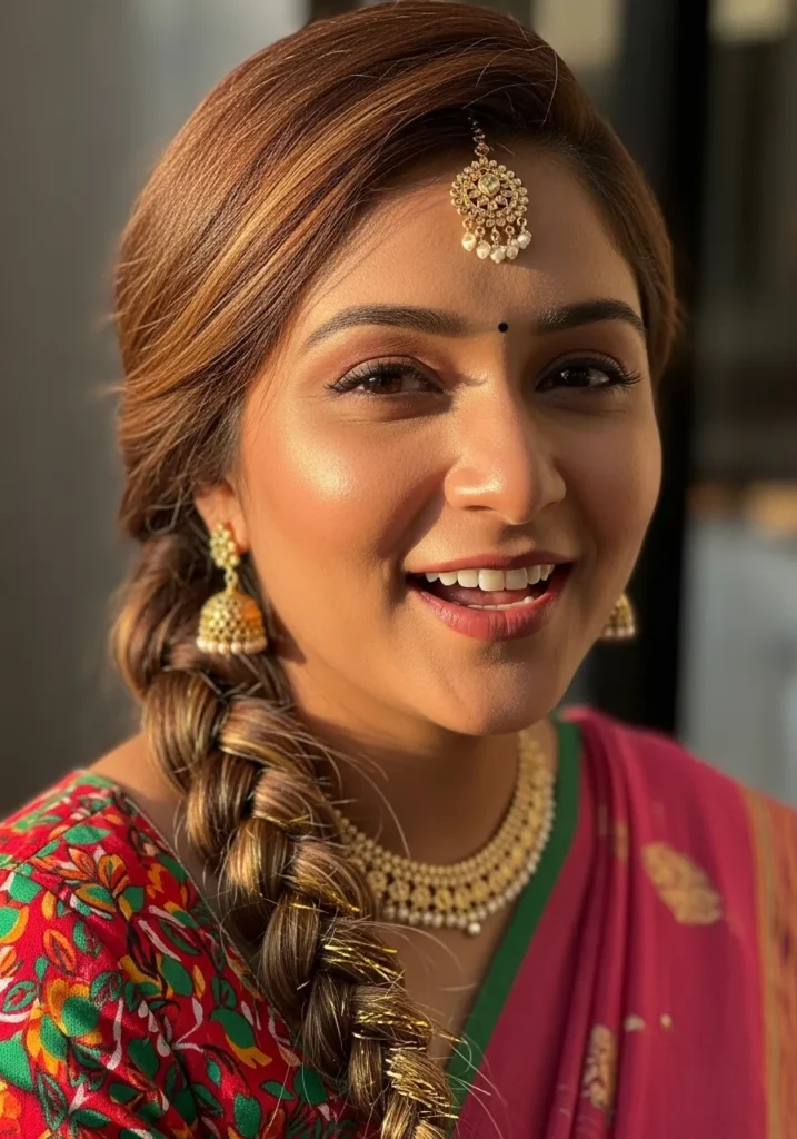I love how rich and regal this braid looks. It feels traditional with a festive twist, and the golden highlights make it pop in the prettiest way. It’s such a confident, radiant hairstyle for celebrating in style.