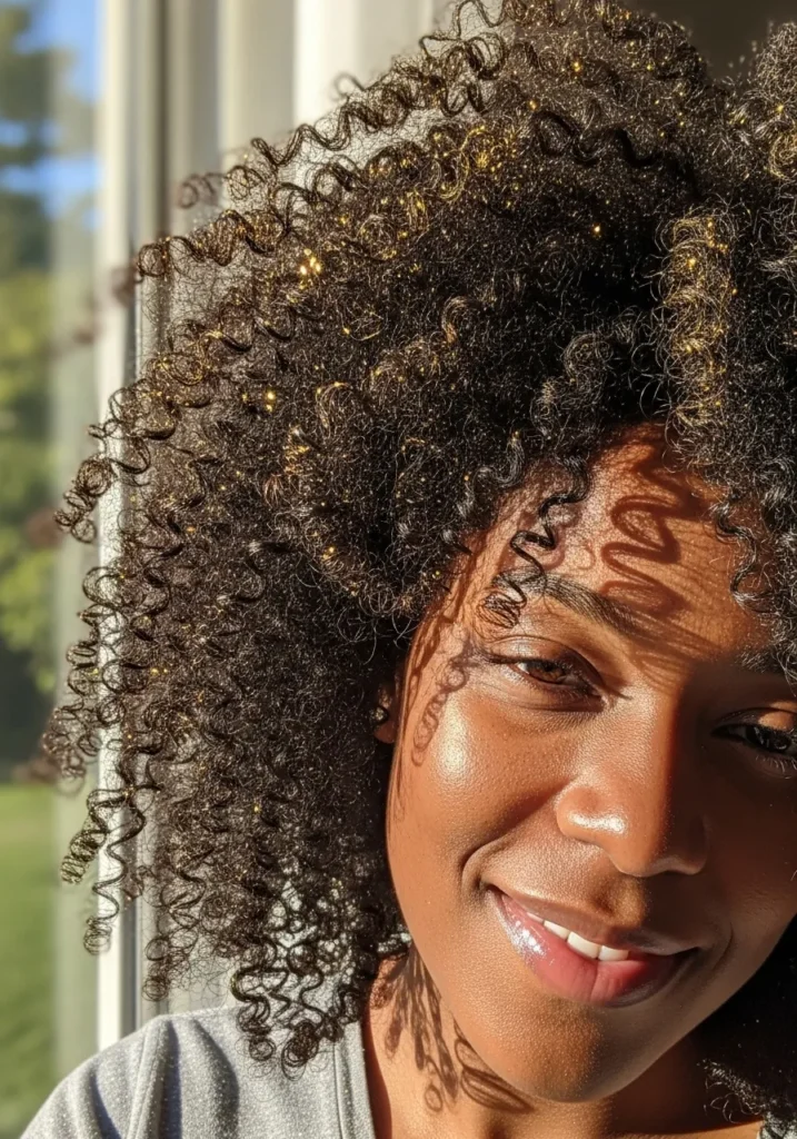 These soft, springy curls are full of life and volume, sprinkled with tiny flecks of gold glitter that shimmer in the sunlight. The texture is beautifully defined, and the natural shape frames the face in the most effortless way.