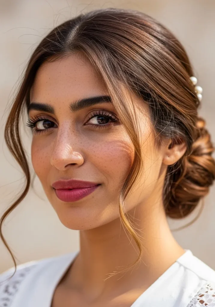 This low chignon bun radiates timeless beauty. Smooth brunette hair is twisted neatly at the nape, with a few soft tendrils left out to frame the face. Tiny pearl pins peek through the bun, giving it that delicate, romantic touch that’s ideal for a New Year’s soirée.