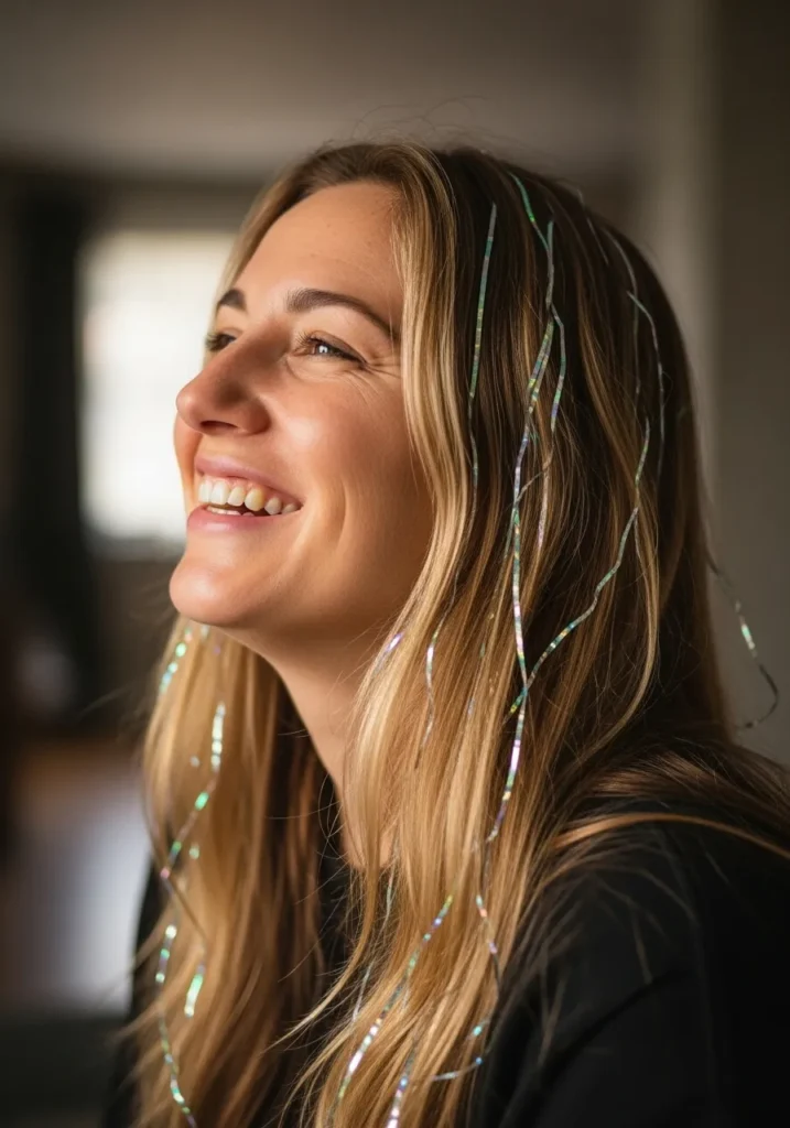 I can’t get enough of this one—it’s the easiest way to make my everyday hair feel party-ready. The tinsel sparkles beautifully when it catches the light, and it instantly lifts my mood. It’s low effort, high payoff, and honestly, that’s my favorite kind of beauty trick.