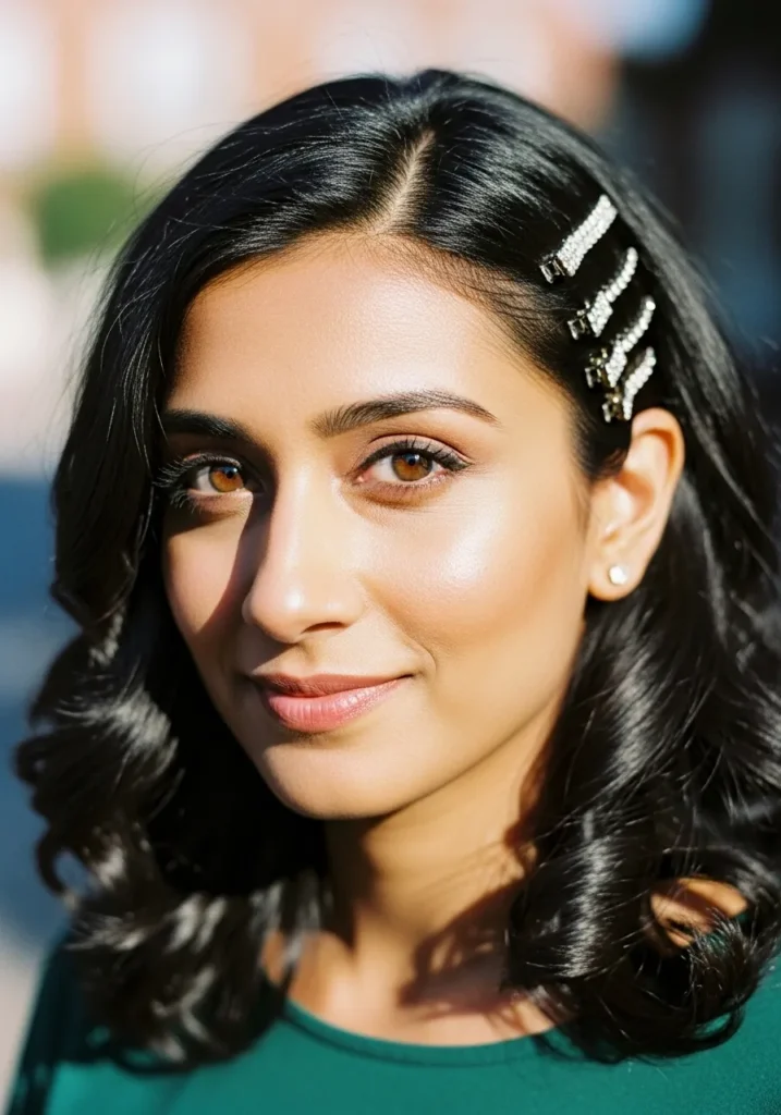 I adore how this hairstyle feels both vintage and modern at the same time. The clips make it look like you’ve just stepped out of an old Hollywood movie but with a cool, 2025 twist. It’s glam without being fussy, which makes it perfect for dancing all night.