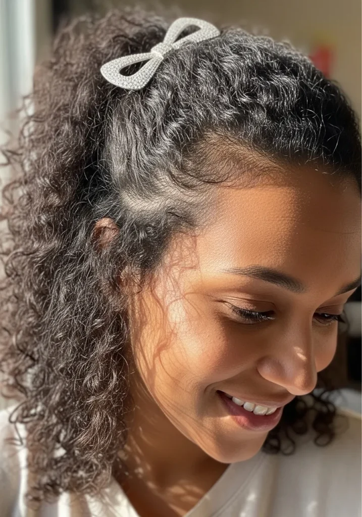 This curly half-up look feels sweet and festive. Natural curls are gathered into a half-up ponytail, secured with a sparkly diamond bow clip that instantly draws the eye. The curls are soft and voluminous, creating that perfect mix of playful and chic.