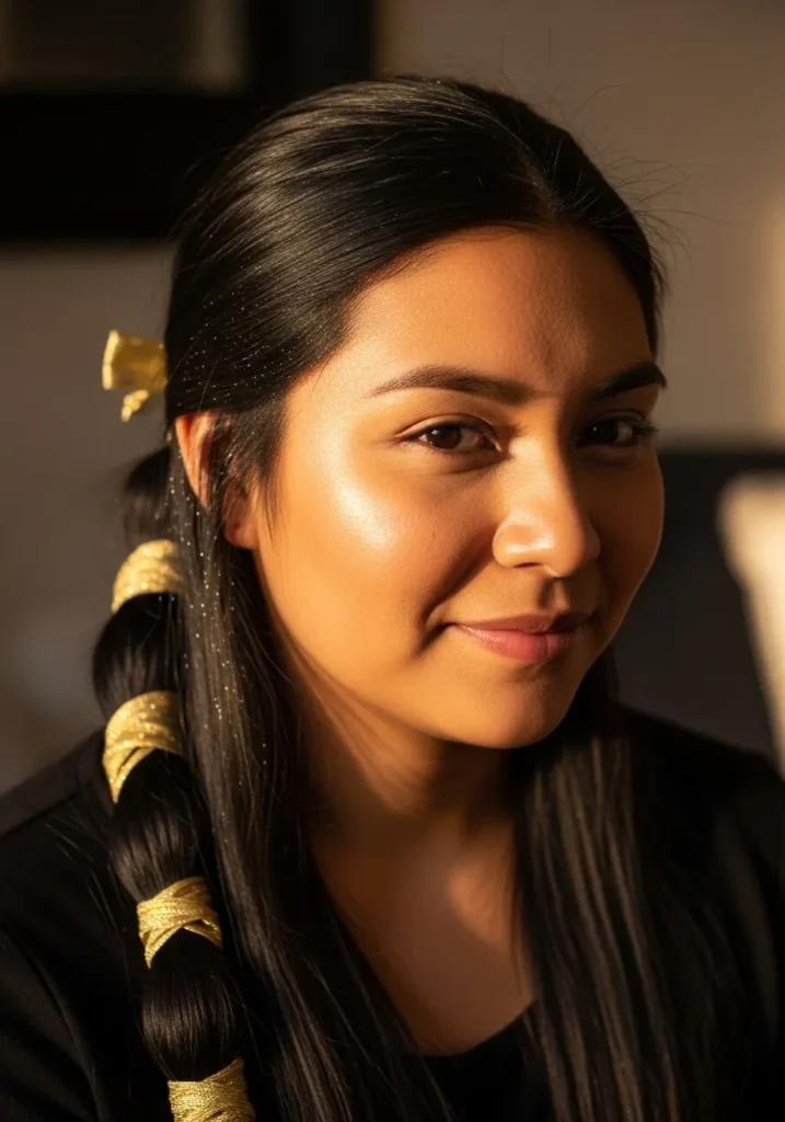 This sleek, low braid looks polished and festive with strands of dark, glossy hair neatly tied off using shimmering gold wraps. The hair is smooth, straight, and gathered into a thick braid that keeps every strand in place. A soft dusting of glitter catches the light, making this look glow under evening lights.