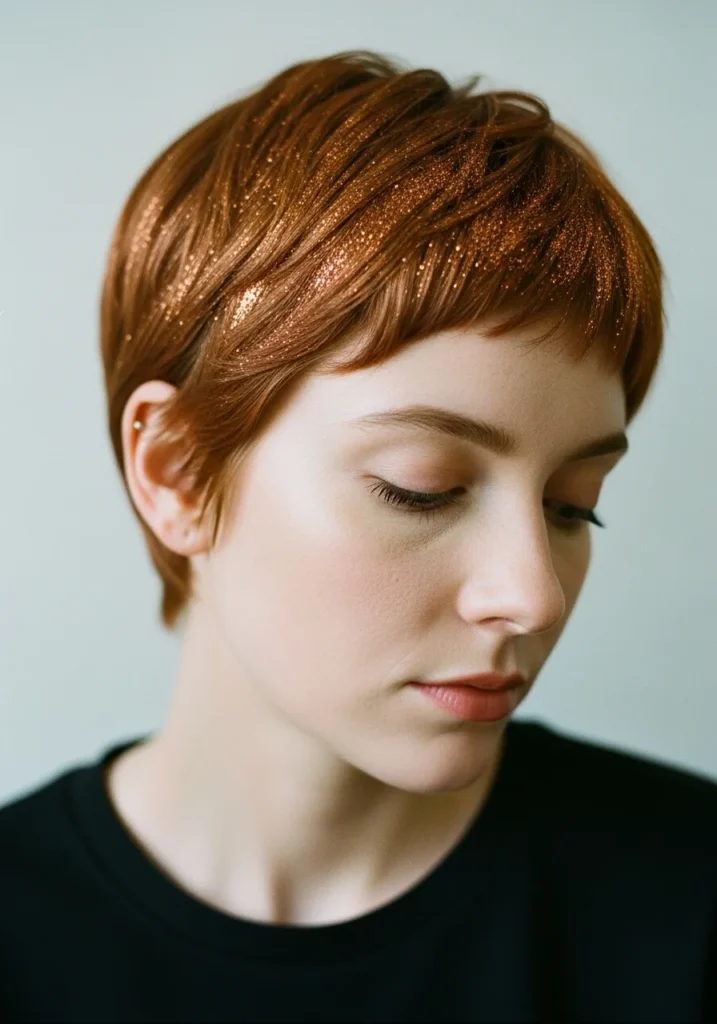 This short pixie cut is a total showstopper. The copper shade glows under the light, and the glitter brushed over the strands gives it an unexpected, party-ready twist. The texture is soft and layered, framing the face in the most delicate way.