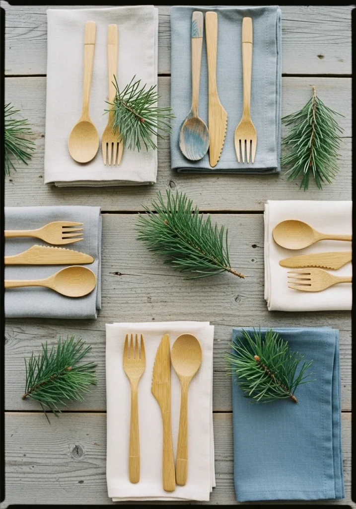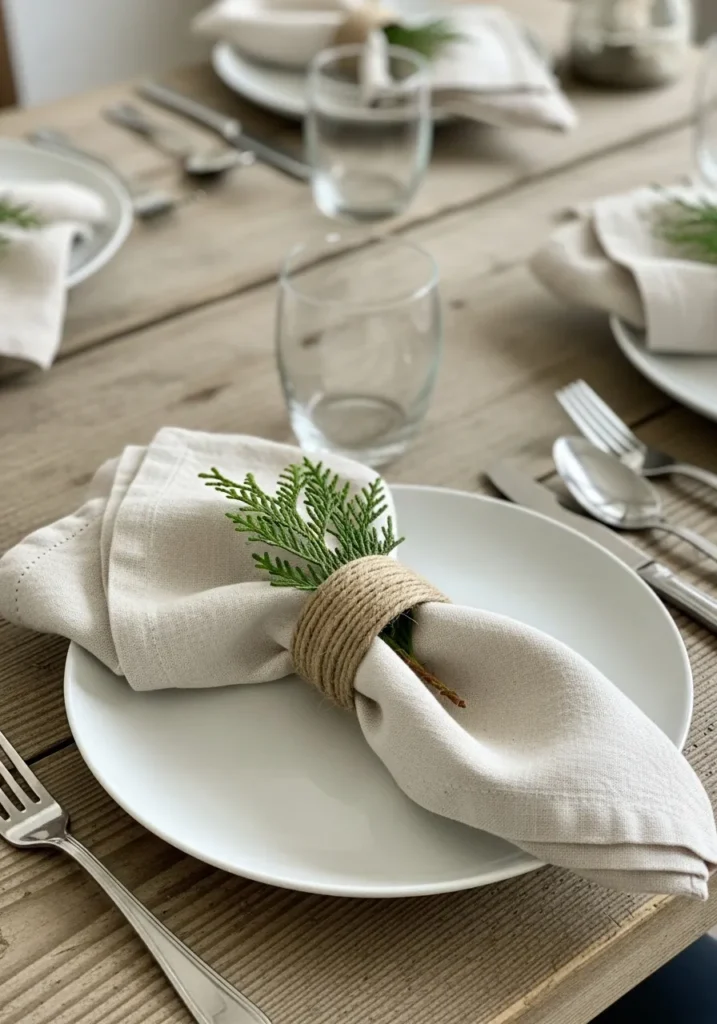 This table decor uses folded napkins in muted tones paired with pine sprigs and wooden cutlery for a natural, Scandinavian-inspired look. The mix of soft fabrics and organic materials creates a soothing and earthy atmosphere.