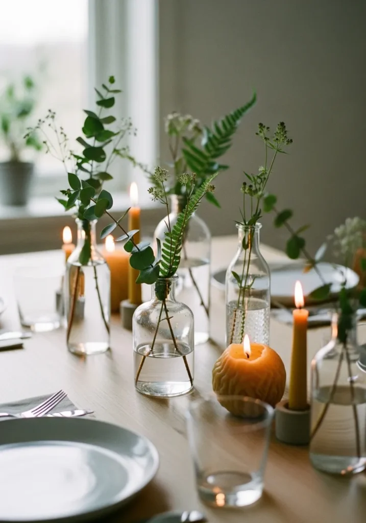 This elegant setup combines clear glass bottles filled with greenery and ferns, surrounded by soft candlelight. The flicker of the candles highlights the delicate textures of the plants, creating a warm and natural glow that feels romantic and festive at the same time.