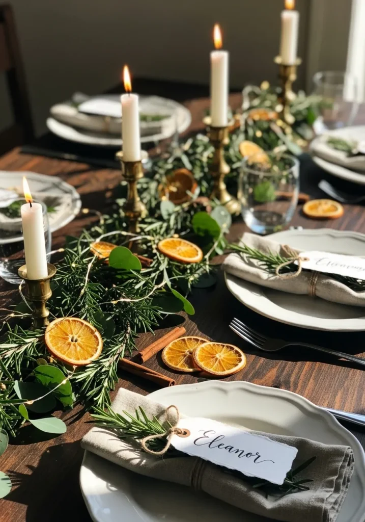 This gorgeous table uses a mix of rosemary, eucalyptus, and orange slices intertwined with glowing candles. The citrus adds color and fragrance, while the brass candle holders bring a touch of timeless elegance to the rustic wooden table.