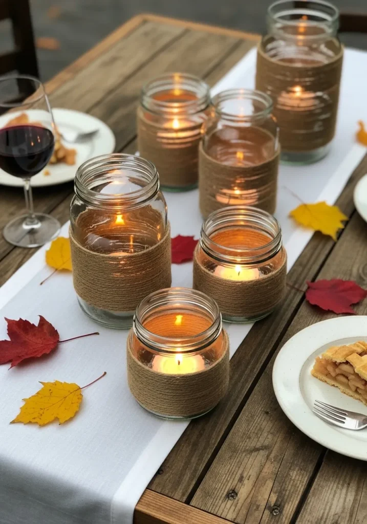 This outdoor-inspired table design features mason jars wrapped in twine, glowing softly with candlelight. They’re arranged down the center on a simple white runner, surrounded by scattered fall leaves for a warm and inviting touch.