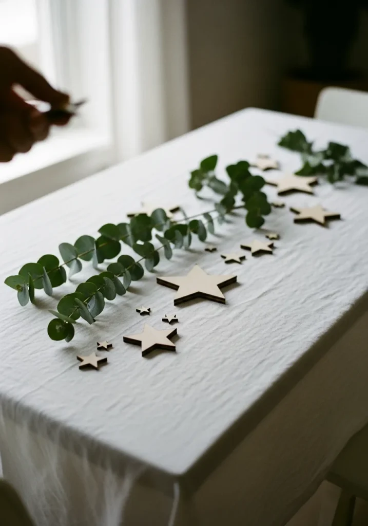 This table feels light and calming with a simple white cloth, fresh eucalyptus branches, and scattered wooden stars in different sizes. The combination of greenery and wood creates an effortless natural look that still feels festive and charming. It’s the kind of setup that looks perfectly styled but requires almost no effort.