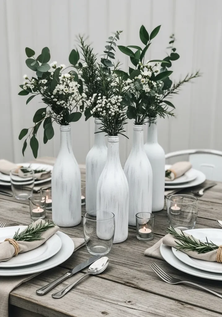 This setup turns old bottles into chic vases, painted in soft white and filled with eucalyptus, rosemary, and baby’s breath. The muted tones look elegant against the weathered wood table, and the tiny tealights scattered around add just the right sparkle.