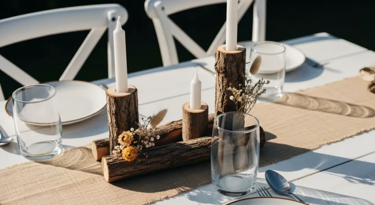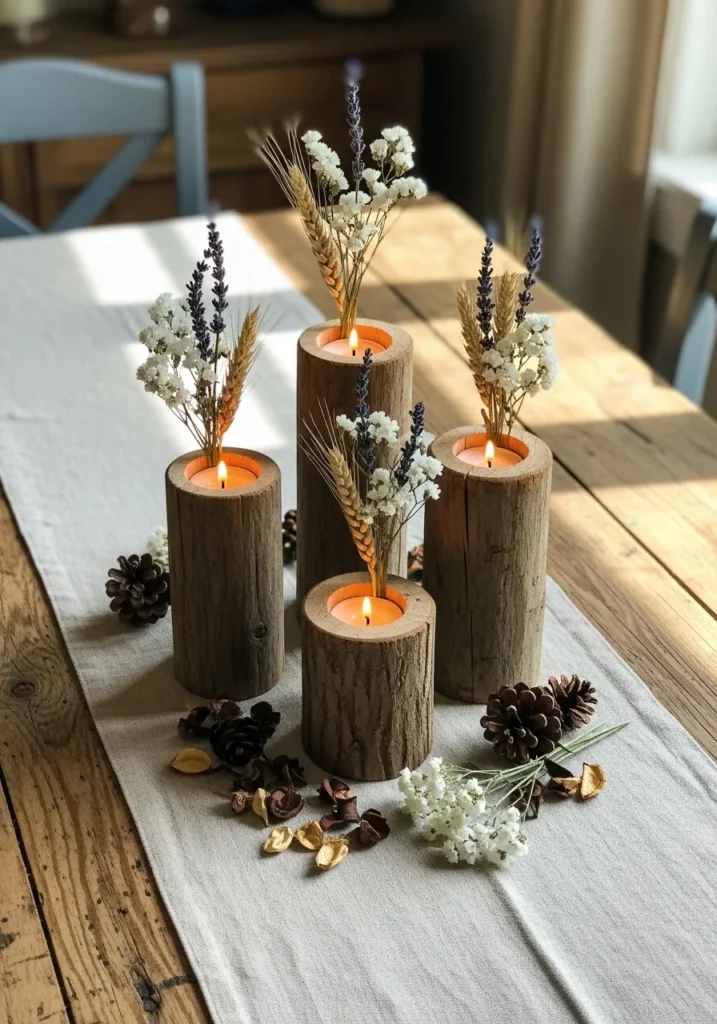 This setup combines rustic wood log candle holders with delicate dried flowers like wheat, lavender, and baby’s breath. The natural textures of the wood and the warm candlelight make it feel both organic and inviting.