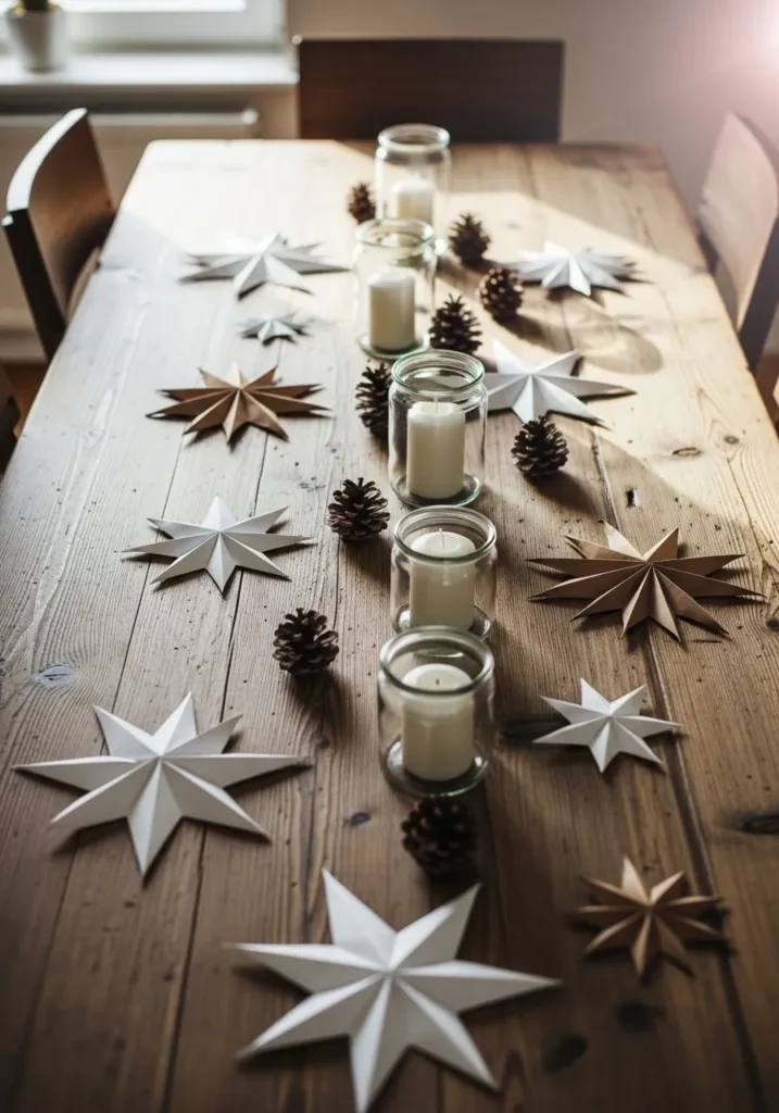 This design is a cozy mix of simplicity and charm, with glass jar candles surrounded by pinecones and folded paper stars in white and brown. The wooden table underneath brings warmth, while the stars add a handcrafted Christmas touch that feels both nostalgic and modern.