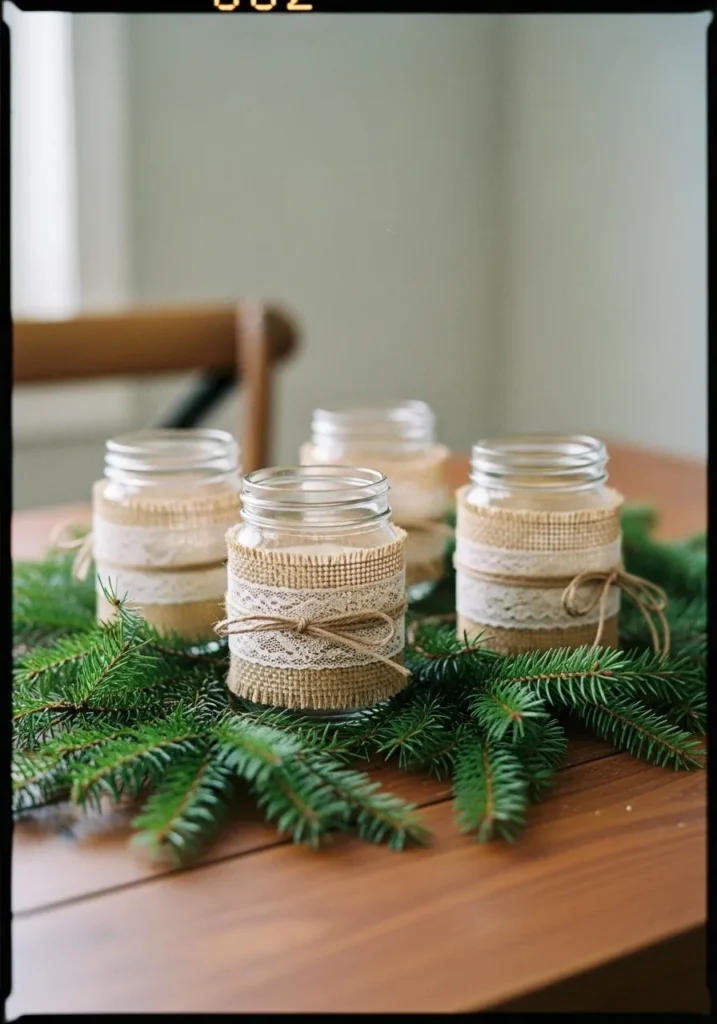 Here, glass jars wrapped in burlap and lace take center stage. They’re placed over a bed of evergreen branches, creating the most charming DIY candleholders. The mix of textures—soft greenery, rough burlap, and delicate lace—makes this look feel both rustic and romantic.