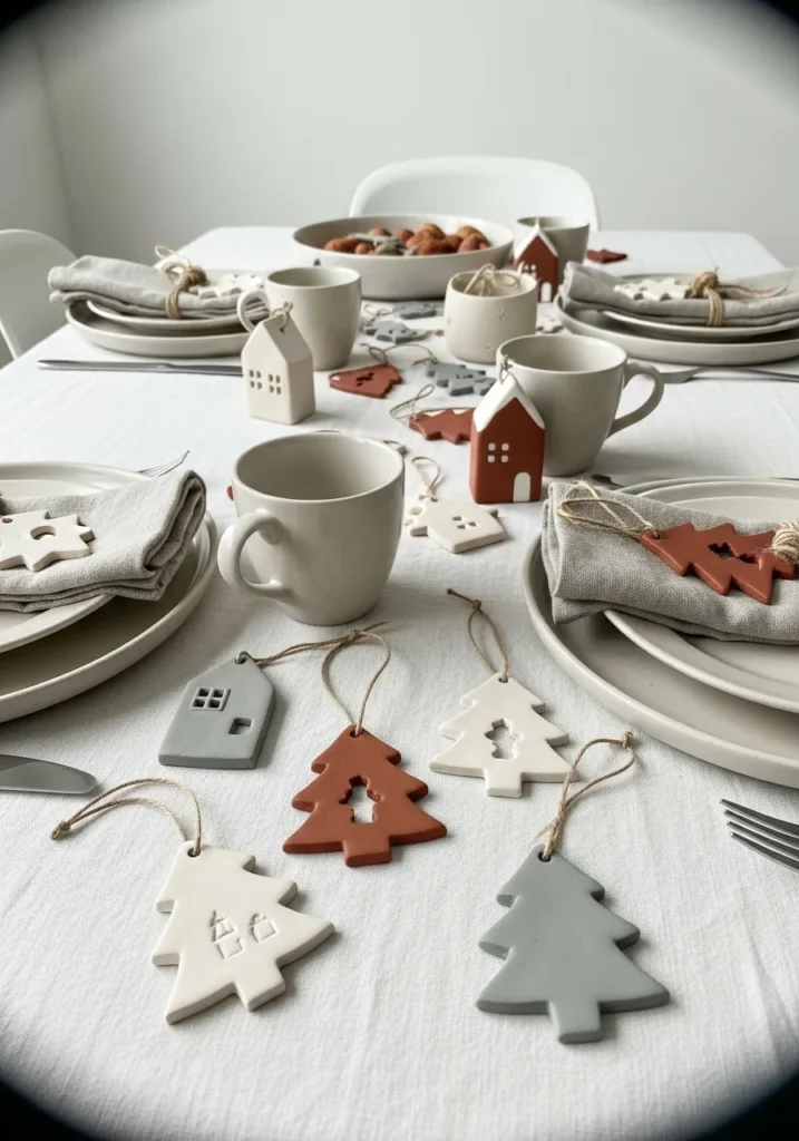 This playful setting uses handmade clay ornaments in tree and house shapes scattered across a white tablecloth. The soft neutral tones of beige, gray, and terracotta make everything feel calm and cohesive. It’s a whimsical take on Christmas that’s still beautifully minimal.
