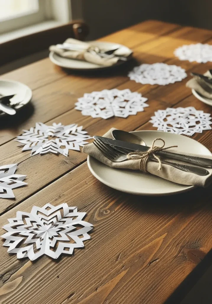 This sweet and nostalgic setup features hand-cut paper snowflakes scattered across a wooden table, with linen napkins tied in twine for a cozy finish. The sunlight catching the white paper gives it a soft, handmade glow that feels festive and fun.