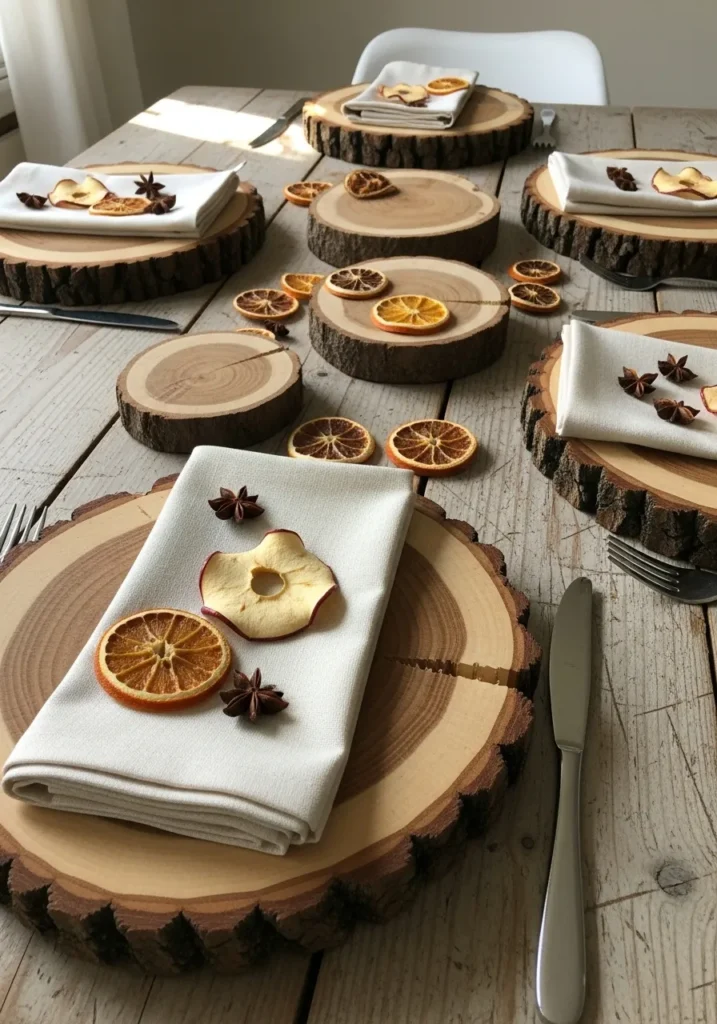 This cozy and creative table uses natural wood slices as chargers, paired with white napkins topped with dried oranges, apple slices, and star anise. The mix of textures and natural tones creates a warm, earthy atmosphere that feels straight out of a country Christmas kitchen.