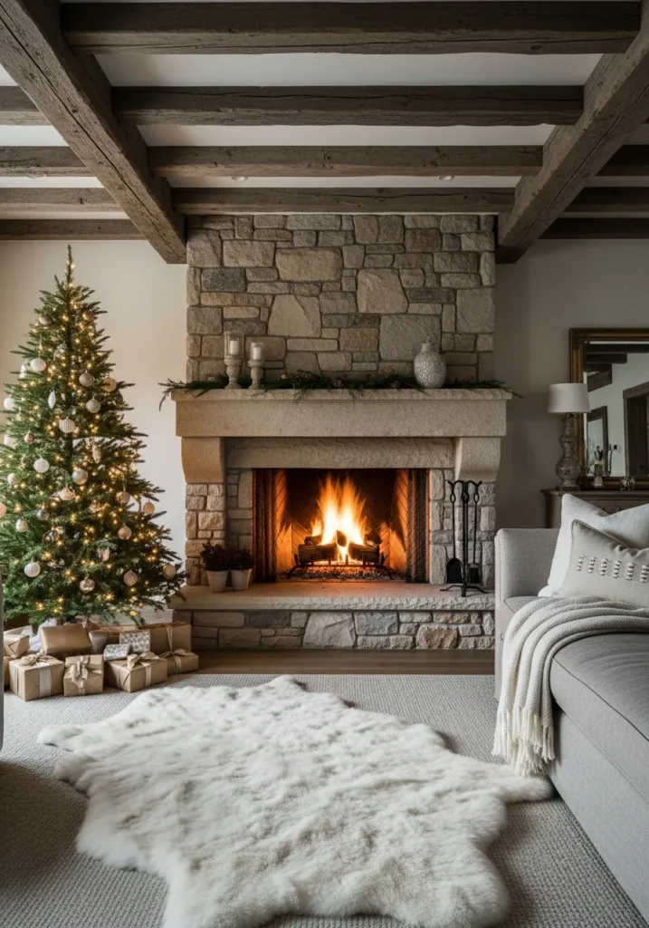 This living room feels like pure Christmas warmth wrapped in sophistication. The rustic stone fireplace instantly becomes the heart of the space, glowing with soft golden light from the crackling fire. A beautifully simple Christmas tree stands nearby, dressed in classic gold and white ornaments that sparkle gently under the twinkle lights. The neutral palette of creams, taupe, and natural wood keeps the atmosphere calm and inviting, while the fluffy white rug adds a touch of winter luxury. Every detail, from the wrapped presents to the garland on the mantel, whispers quiet elegance rather than shouting festivity.