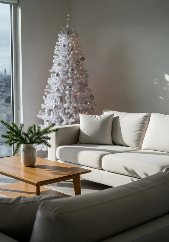 This minimalist Christmas living room feels effortlessly calm and refined. The soft beige sofas, paired with a simple wooden coffee table, create a space that feels light yet grounded. The white Christmas tree in the corner steals the show, dressed in silver ornaments and soft fairy lights that sparkle gently in the daylight. The whole room bathes in natural light, making every texture—from the crisp linen cushions to the matte ceramic vase—feel fresh and airy.