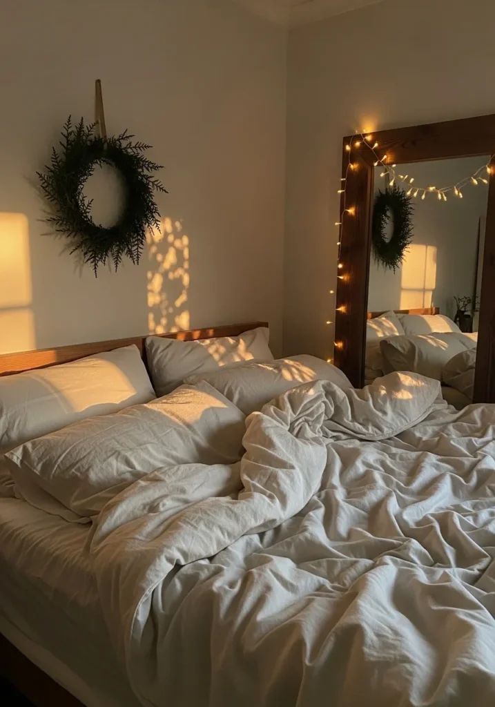This cozy bedroom feels like a quiet December morning wrapped in sunlight. The soft cream bedding looks effortlessly inviting, with just the right amount of texture to feel relaxed yet refined. A simple green wreath adds a natural festive touch, and the string lights reflected in the mirror create a soft, golden glow that feels straight out of a winter dream. The whole space embraces simplicity, relying on warm light and gentle contrast instead of over-the-top decorations.