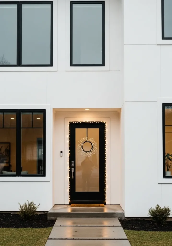 This sleek modern entryway feels effortlessly elegant with its crisp white façade, black-framed windows, and glass-paneled front door wrapped in a gentle string of warm white lights. The minimalist wreath adds just the right touch of Christmas spirit without overwhelming the clean lines of the home. The smooth concrete path leading up to the door creates a polished symmetry that feels both inviting and sophisticated.