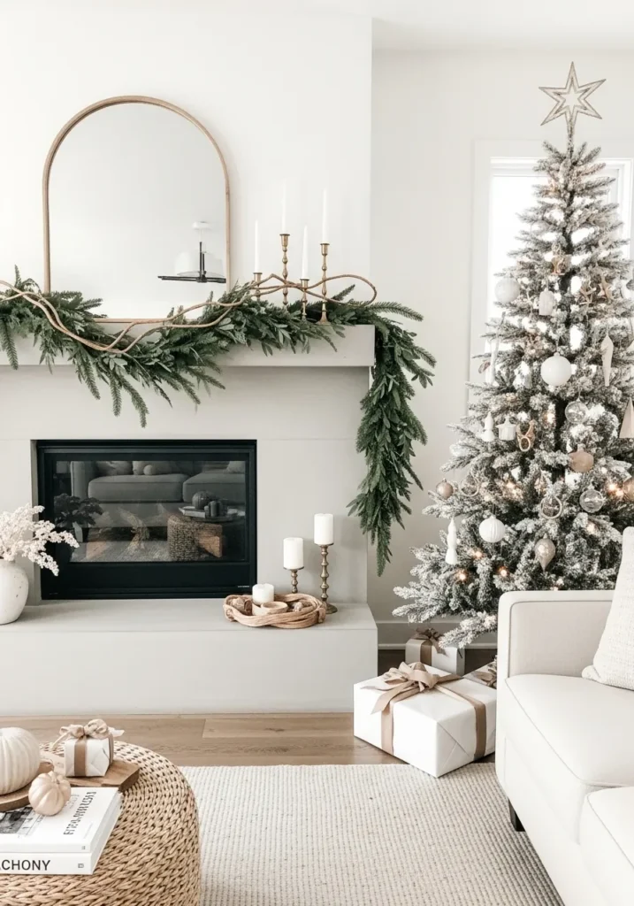 This design feels like a warm hug wrapped in winter whites. The softly flocked Christmas tree sparkles with neutral ornaments in champagne and ivory tones, perfectly matching the clean cream sofa and pale wood floors. A garland of fresh greenery drapes gracefully across the mantel, while brass candlesticks and a round mirror add that subtle vintage charm we all secretly adore. The overall palette is calm and cohesive, with textures like woven rattan, linen, and wrapped gifts adding layers of cozy sophistication.