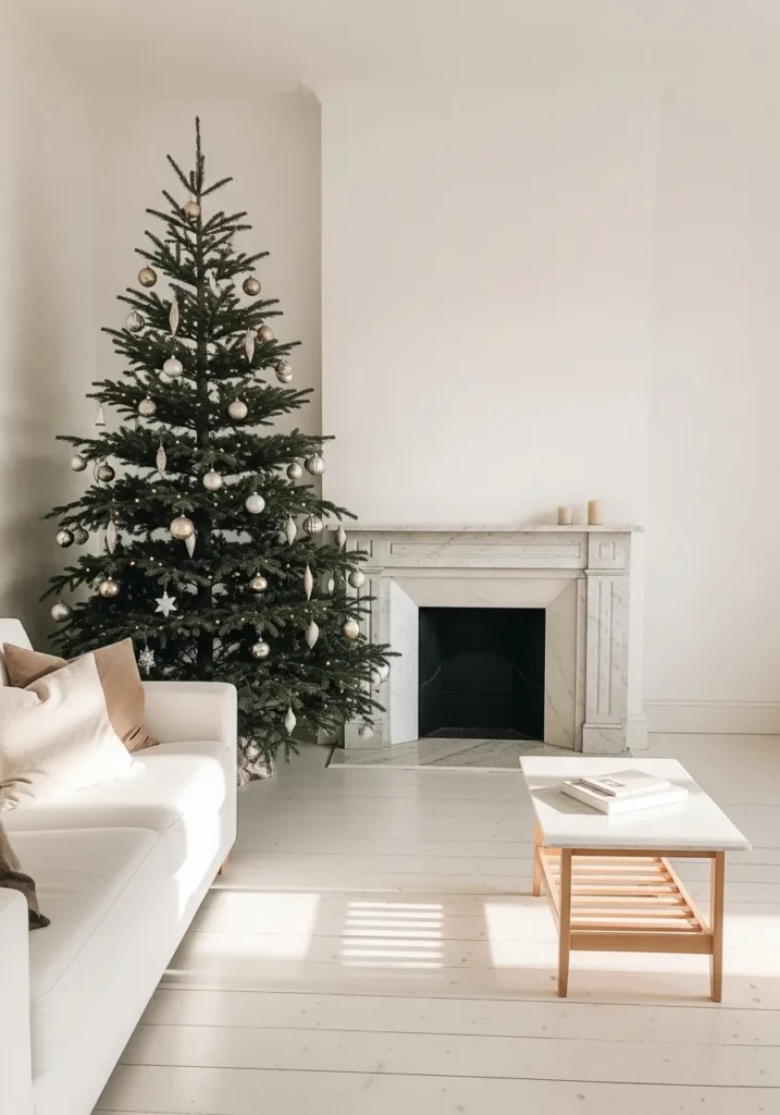 This space captures the kind of quiet Christmas elegance that feels effortlessly luxurious. A tall evergreen tree dressed in silver and champagne ornaments stands gracefully beside a white marble fireplace, setting a tone of calm sophistication. The soft neutral palette—white walls, pale wood floors, and a simple cream sofa—lets the natural greenery and metallic ornaments shine. The sunlight streaming through the window adds the final touch, making everything feel airy, warm, and peaceful.