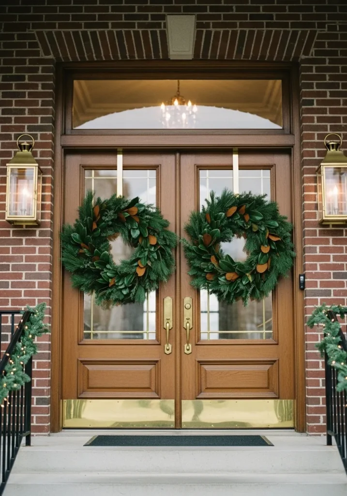 I absolutely love how this design captures that “less is more” kind of beauty. The symmetry of the wreaths feels so satisfying, and the gold accents bring just the right touch of glamour without going overboard. It’s the kind of doorway that makes you pause for a second before knocking because it just feels so refined and inviting. Honestly, if I had an entryway like this, I’d probably find excuses to walk past it every night just to admire those glowing lanterns.