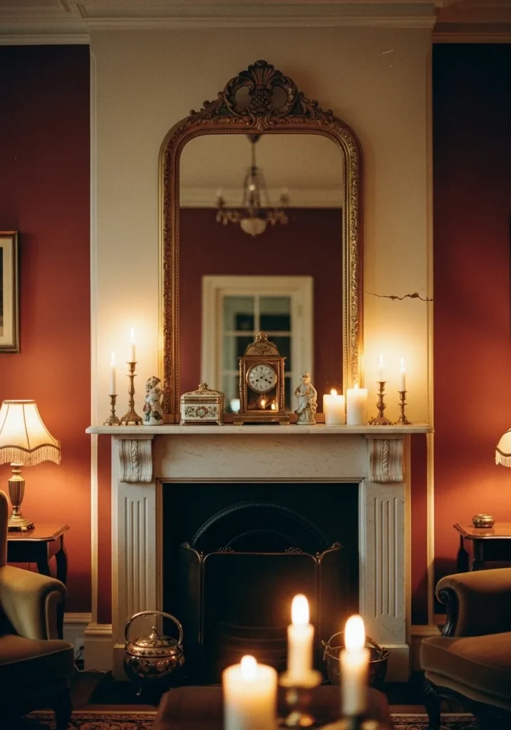 This beautiful living room captures that old-world charm that feels straight out of a classic holiday movie. The creamy white fireplace, framed by deep red walls, becomes the heart of the room. A grand gold-trimmed mirror reflects the soft glow of candles, while antique brass candlesticks, a porcelain clock, and delicate figurines add layers of nostalgia. Every corner is bathed in warm, amber light from fringed lamps, creating a timeless and romantic atmosphere that feels rich yet comforting.