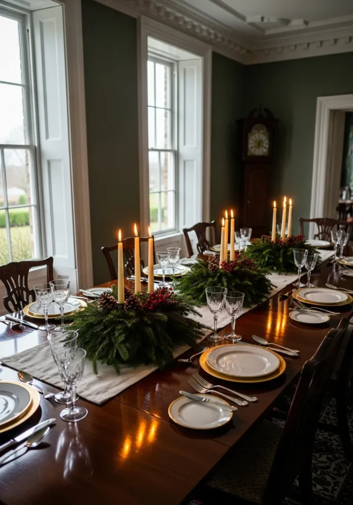 This dining room looks like it was made for elegant holiday dinners. The long polished wood table is dressed with golden-rimmed plates, crystal glassware, and tall ivory candles glowing softly in lush evergreen centerpieces. Each arrangement is rich with pine branches, berries, and pinecones that feel both festive and timeless. The soft light from the windows reflects gently on the table’s surface, giving the whole space that understated old-world charm you’d see in a classic Christmas film.
