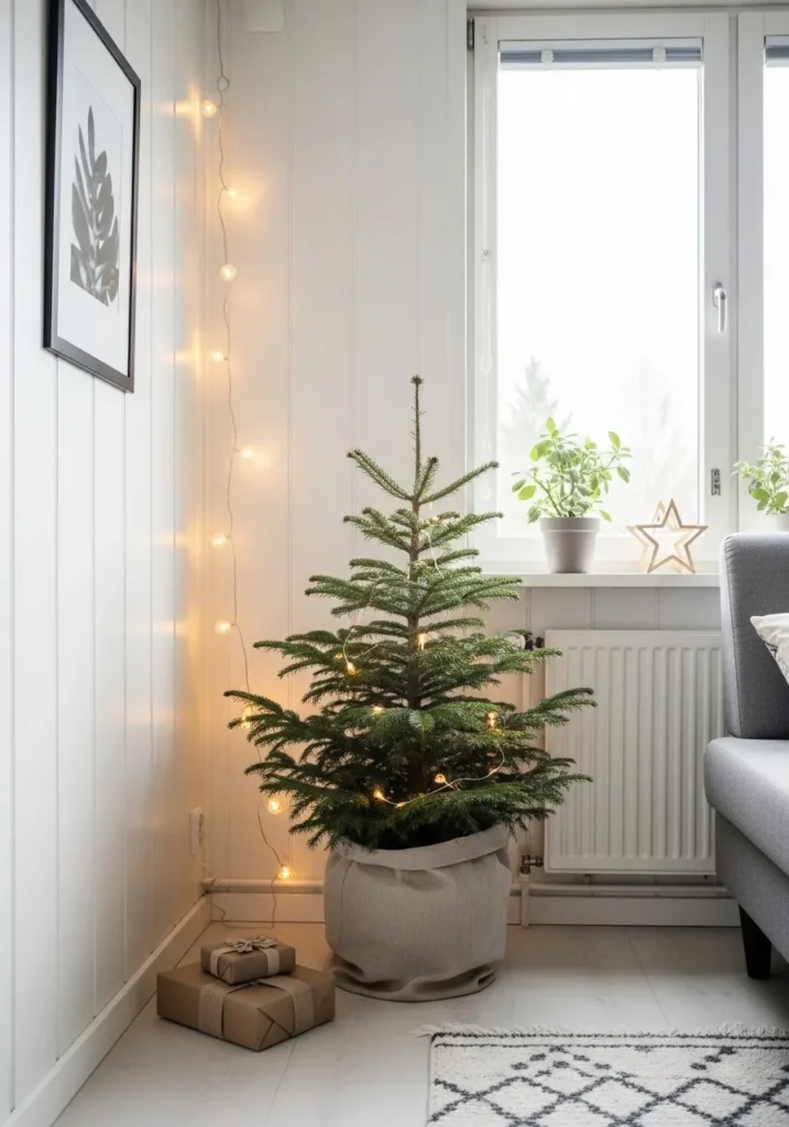 This cozy little corner captures the essence of Scandinavian simplicity at Christmas. A petite evergreen tree sits neatly in a soft beige fabric pot, wrapped in a delicate string of warm fairy lights that gently glow against the white paneled walls. The nearby window lets in a wash of winter light, illuminating potted greenery and a wooden star on the sill. Simple brown-paper gifts rest on the floor, tied with twine for that effortlessly chic, nature-inspired look. Every element feels calm, clean, and beautifully intentional—proof that elegance doesn’t need glitter to shine.