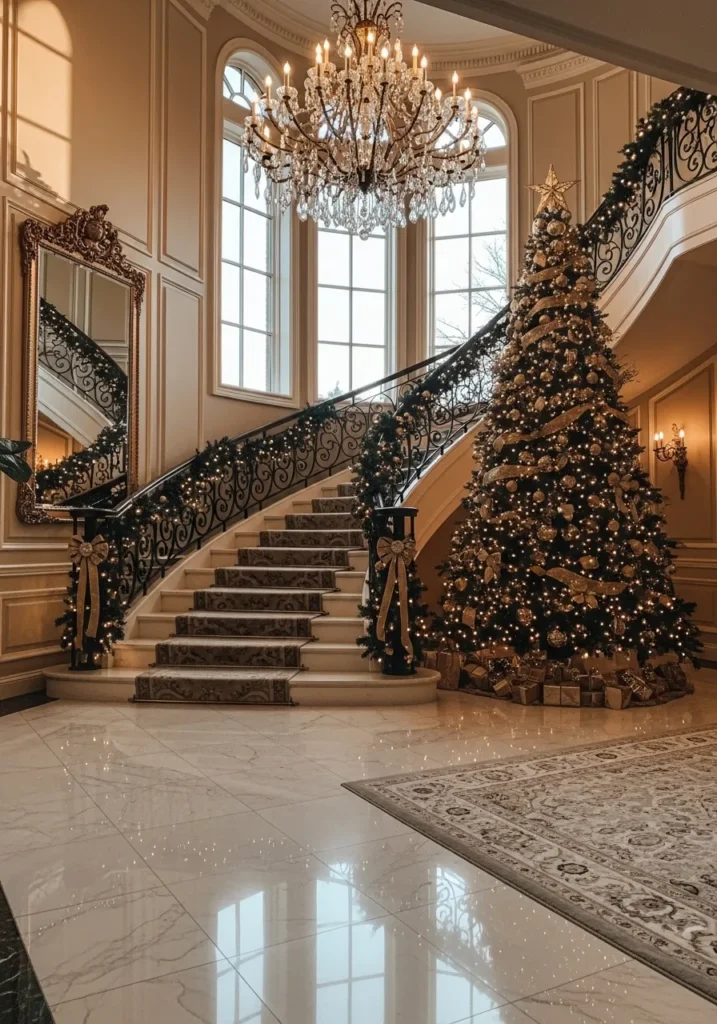 This stunning entryway looks straight out of a holiday fairytale. The sweeping staircase is wrapped in lush garlands trimmed with golden ribbons and twinkling lights that shimmer under an opulent chandelier. A towering Christmas tree stands proudly beside the stairs, covered in matching gold ornaments and glittering bows, with perfectly wrapped presents tucked underneath. The polished marble floors reflect every sparkle, creating a luxurious glow that feels both timeless and festive.