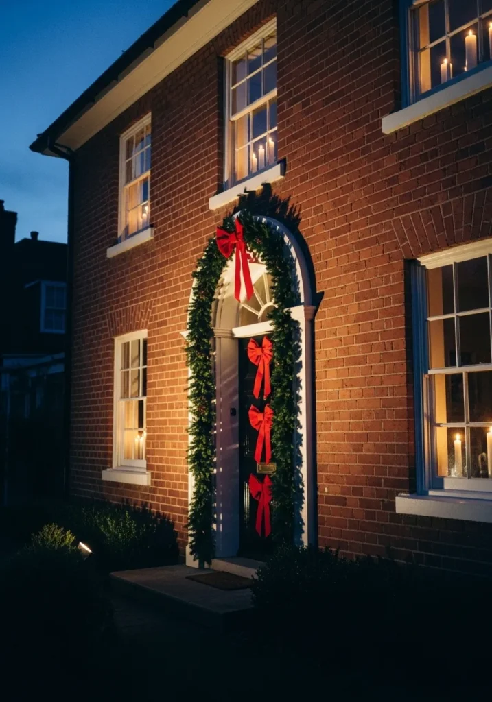 This traditional brick home looks like something straight out of a holiday movie. The deep red bricks pair beautifully with the lush green garland framing the doorway, each strand tied with big, festive red bows that instantly catch the eye. The warm candlelight glowing from the windows adds that magical golden hue that makes the whole house feel cozy and welcoming. It’s simple, symmetrical, and incredibly elegant, the kind of design that never goes out of style no matter the decade.