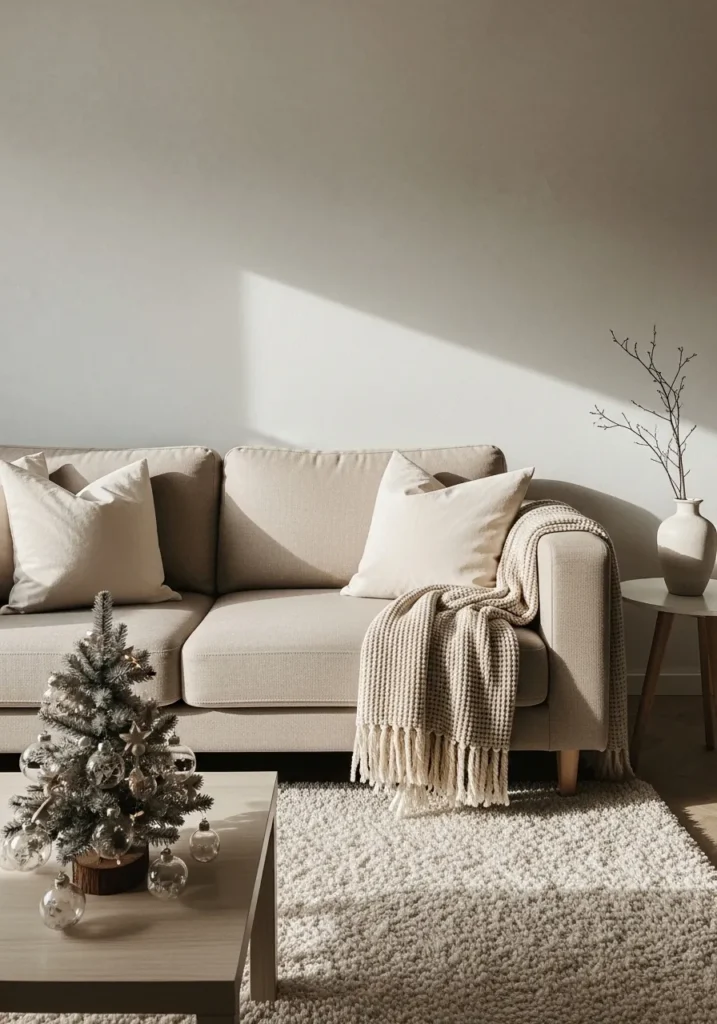 This living room is the definition of calm Christmas elegance. The soft beige sofa, paired with matching pillows and a chunky knit throw, creates a space that feels warm even before you add the tree lights. A tiny frosted Christmas tree on the coffee table brings in the holiday spirit in the most understated way, perfectly complementing the minimal decor. The neutral palette of creams and tans keeps everything cohesive, while the sunlight streaming in adds a cozy golden glow.