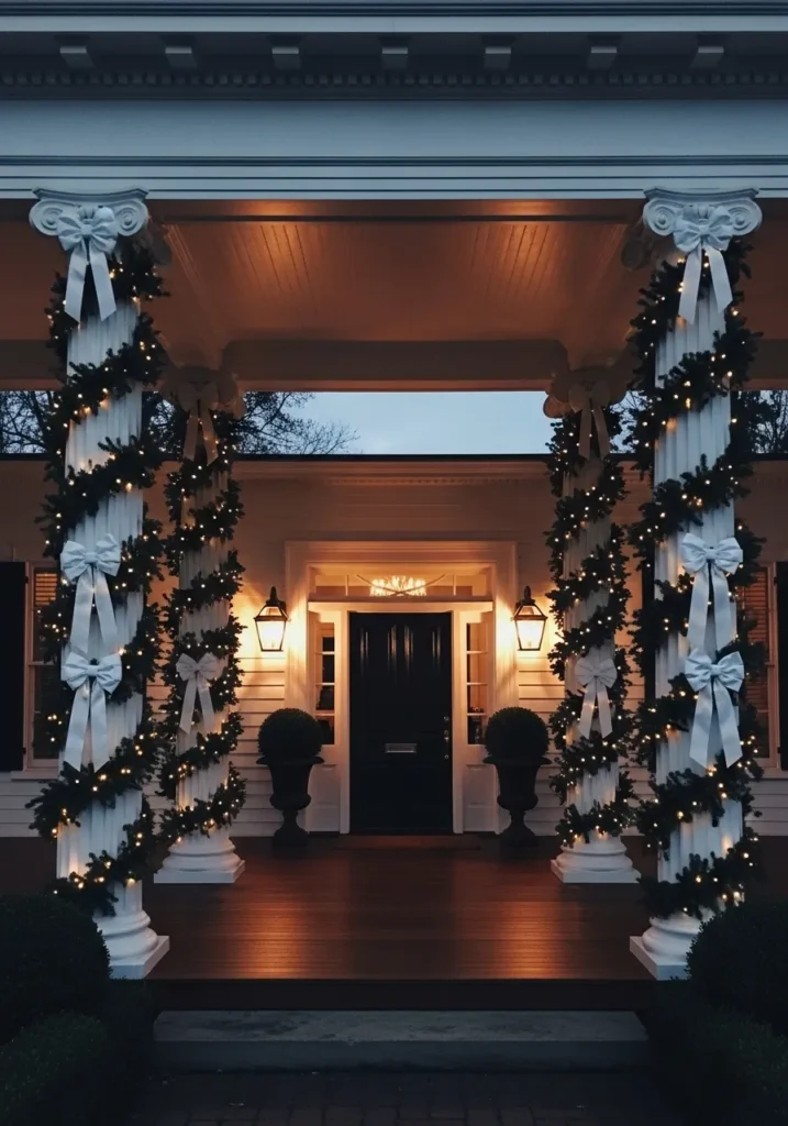 This home’s entrance feels like something straight out of a timeless Christmas movie. The tall white columns wrapped in lush garlands and soft white bows create such a regal yet welcoming look. Twinkling fairy lights run through the greenery, giving the whole porch a golden glow that beautifully complements the classic black front door and warm lantern sconces. The symmetry, the soft lighting, and the touches of evergreen make this exterior feel both stately and heartwarming at the same time.