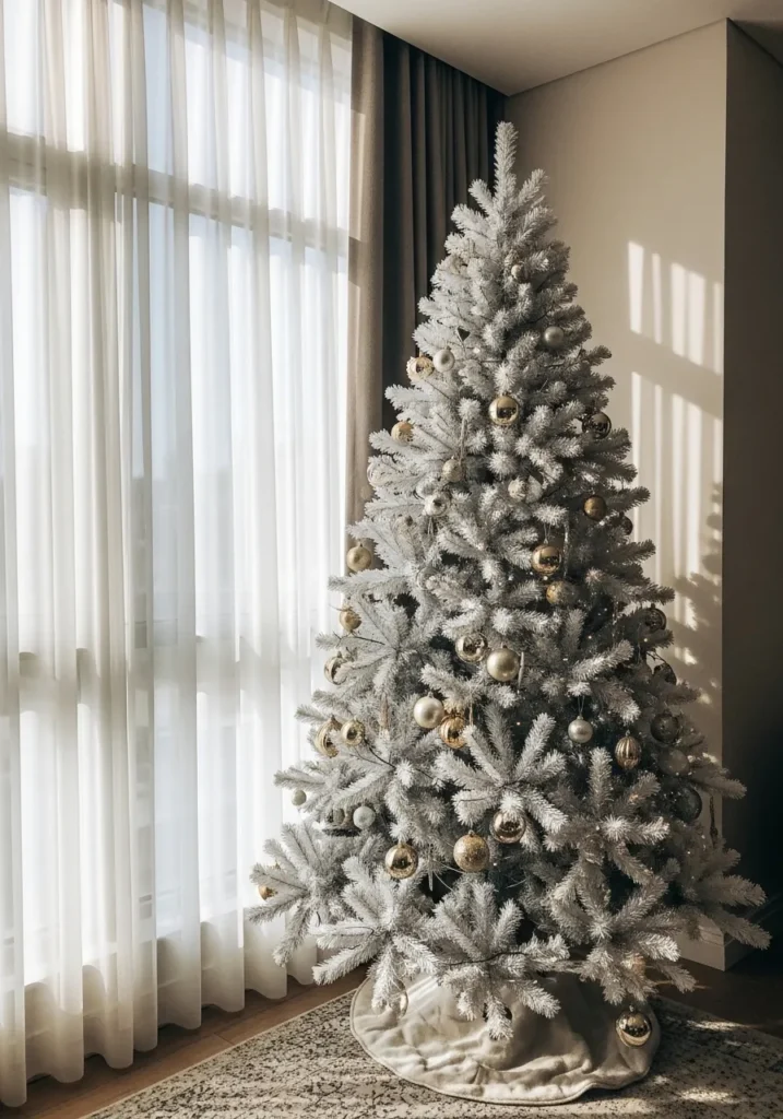 This snowy Christmas tree looks like it was lifted from a serene winter morning. The frosted branches shimmer under the sunlight, decorated with a perfect mix of gold and champagne ornaments that give it an understated glow. The neutral curtains and soft rug below make the space feel fresh and airy.