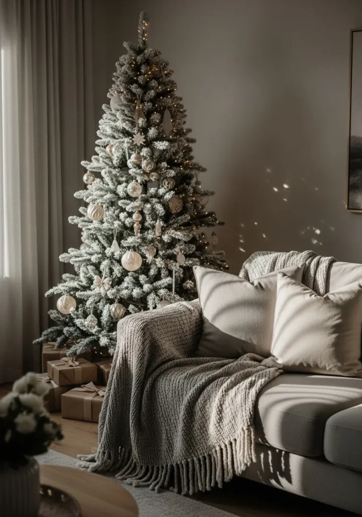This frosted Christmas tree instantly makes the living room feel like a winter retreat. Its snowy branches are covered in neutral ornaments and soft lights, blending perfectly with the cozy textures of the throw blanket and pillows nearby. Everything feels calm, layered, and effortlessly elegant.