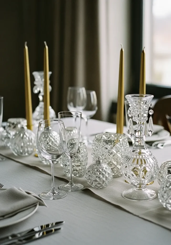This elegant dining table sparkles with crystal details, golden candles, and delicate glass ornaments scattered between them. The crystal candleholders catch the light in the most beautiful way, creating a glow that feels both festive and refined.
