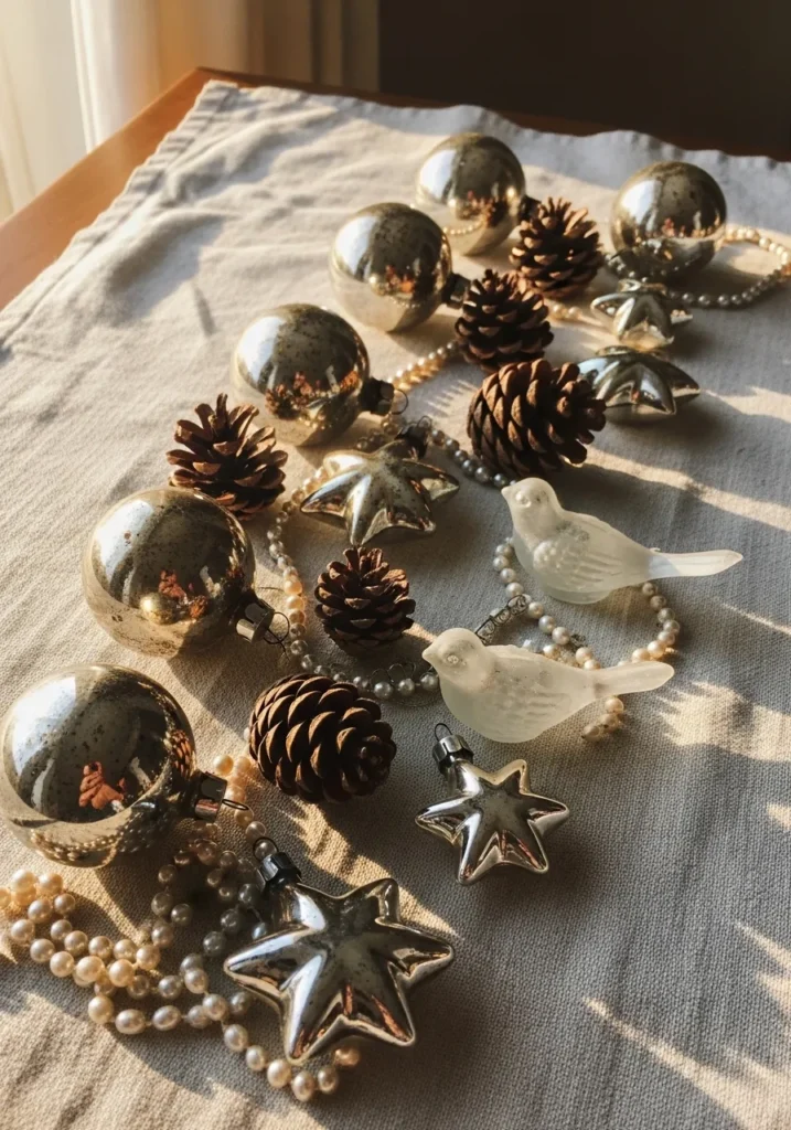 This flat-lay setup combines mercury glass ornaments, pinecones, pearls, and frosted birds for the perfect balance of natural and polished. The warm sunlight enhances the metallic tones, giving everything a soft vintage glow that feels effortlessly timeless.