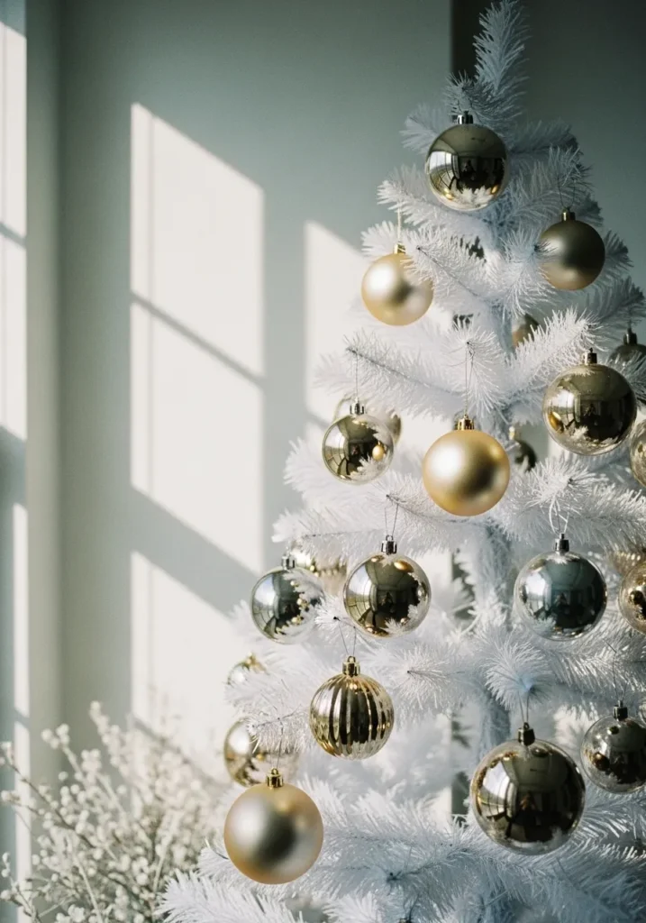 This white Christmas tree feels effortlessly graceful with its mix of gold and metallic ornaments. The soft sunlight streaming through the windows highlights the glossy finishes, creating a look that feels clean, calm, and perfectly timeless. The contrast of white branches and warm tones adds such an elegant balance.