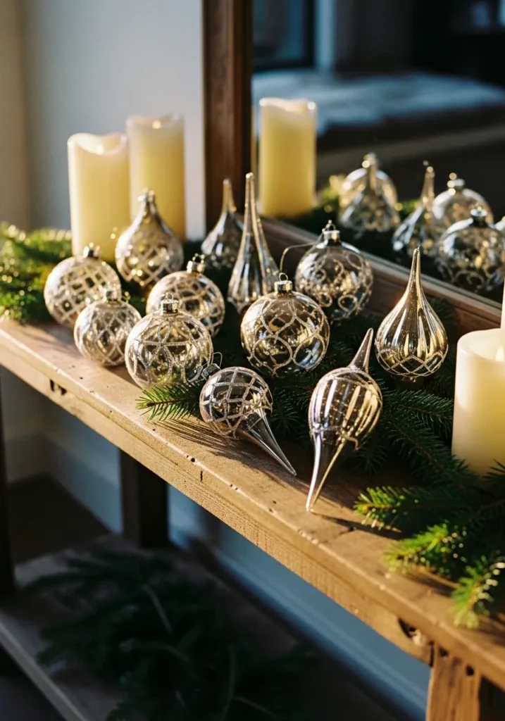 Here, delicate crystal ornaments steal the spotlight. Set on a natural wood console, each piece glistens with golden detailing and soft candlelight reflecting off their surfaces. The mix of glass, greenery, and warm light feels perfectly balanced—classic and festive.