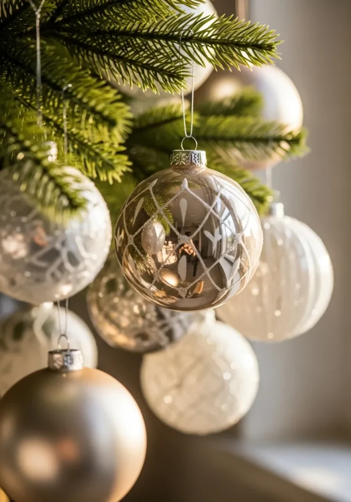 A close-up look at these ornaments reveals a dreamy mix of silver, white, and frosted glass. Each one catches the light differently, making the whole branch feel alive with sparkle. The greenery behind them gives just enough contrast to make everything pop without overwhelming the eye.