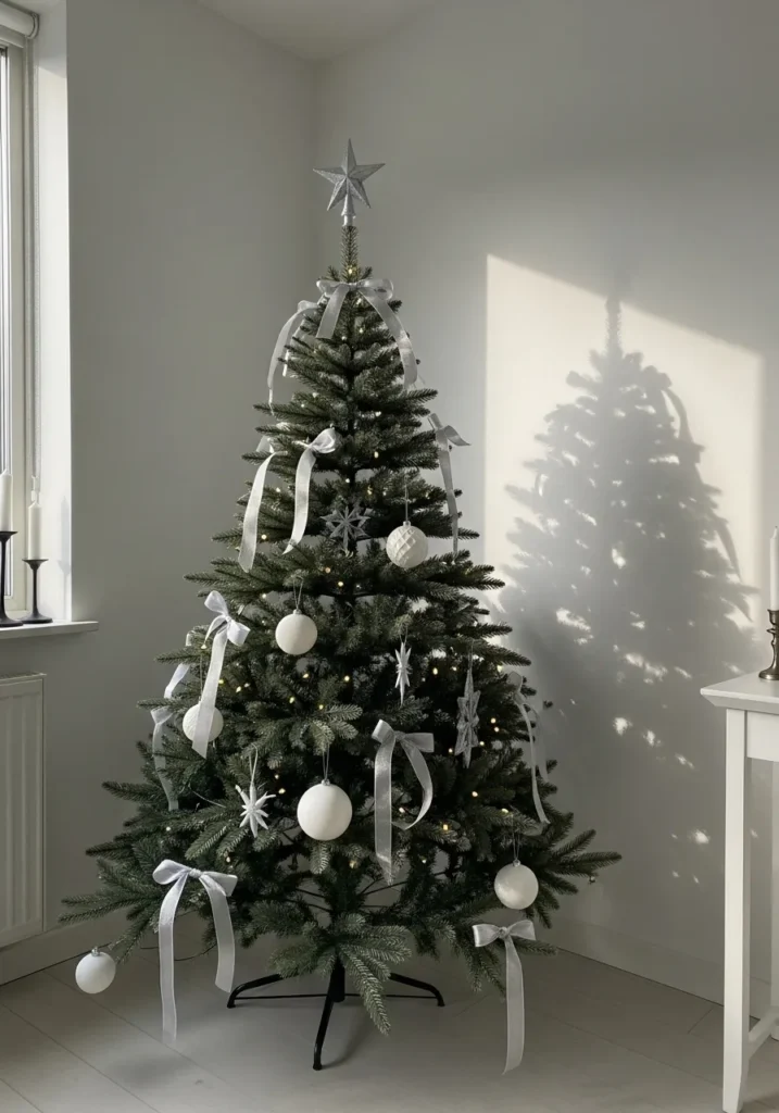This Christmas tree keeps things refreshingly simple. A handful of large white ornaments, silver ribbons, and delicate star toppers add just the right amount of sparkle without crowding the branches. The sunlight casting gentle shadows on the wall makes the space feel calm and serene.